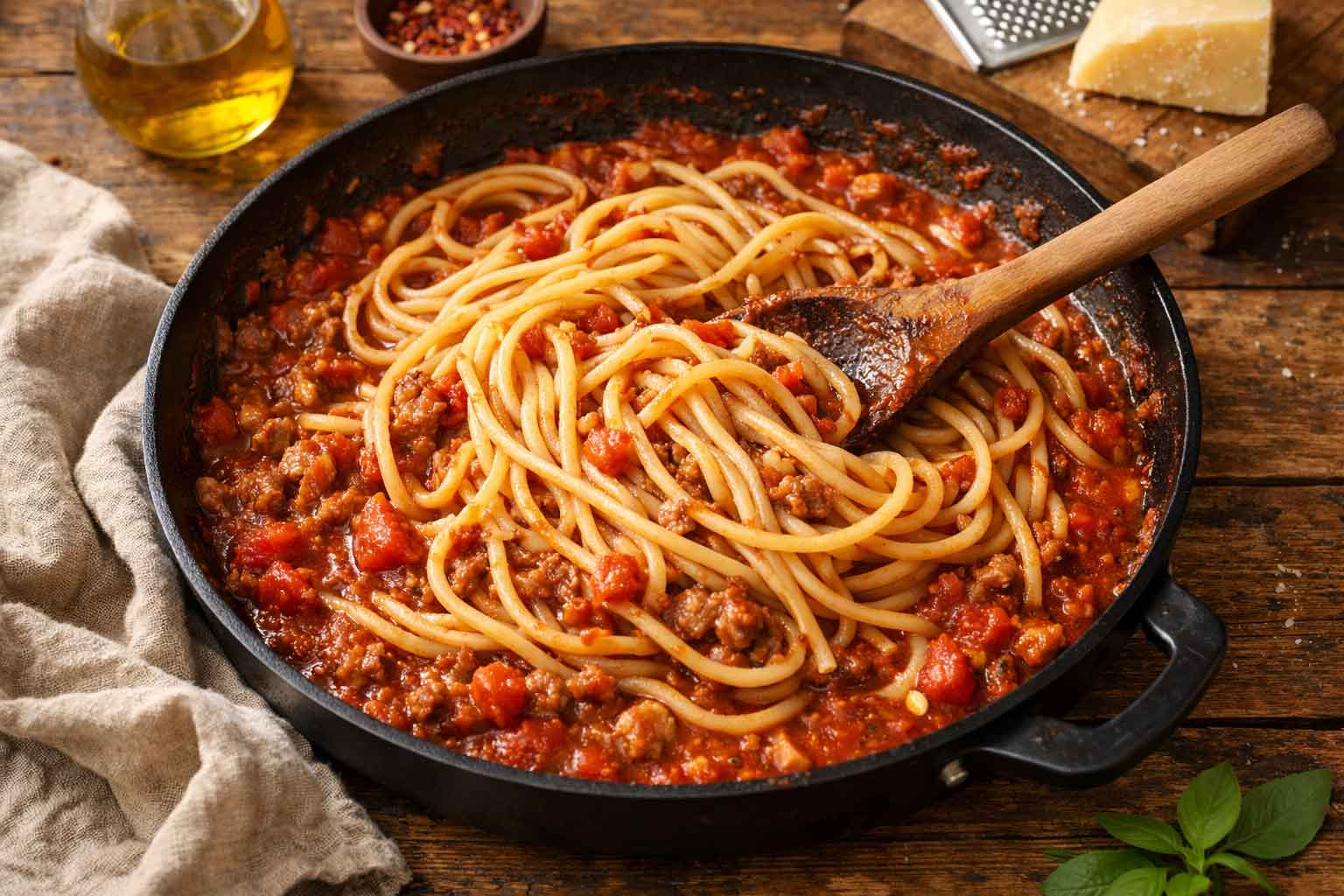 Die gekochten Spaghetti direkt in die Sauce geben und gut vermengen, damit jede Nudel etwas von der würzigen Sauce abbekommt.