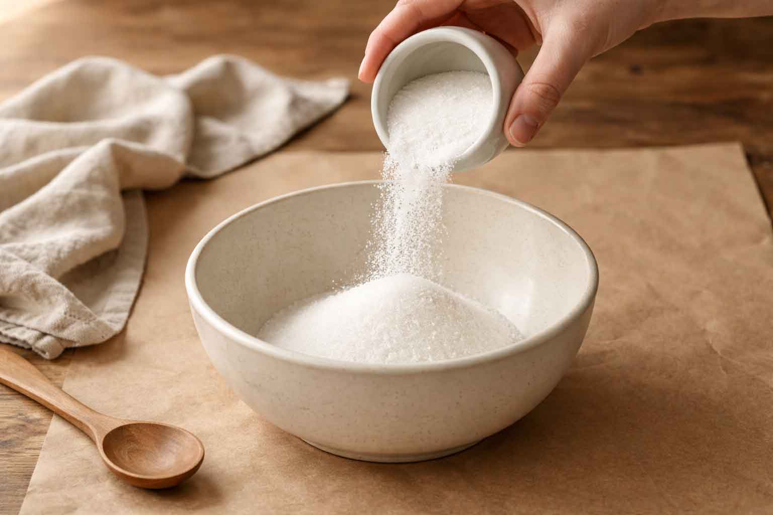 Gib den Zucker oder das Salz in eine Schüssel. Das ist die peelende Grundlage deines Scrubs.