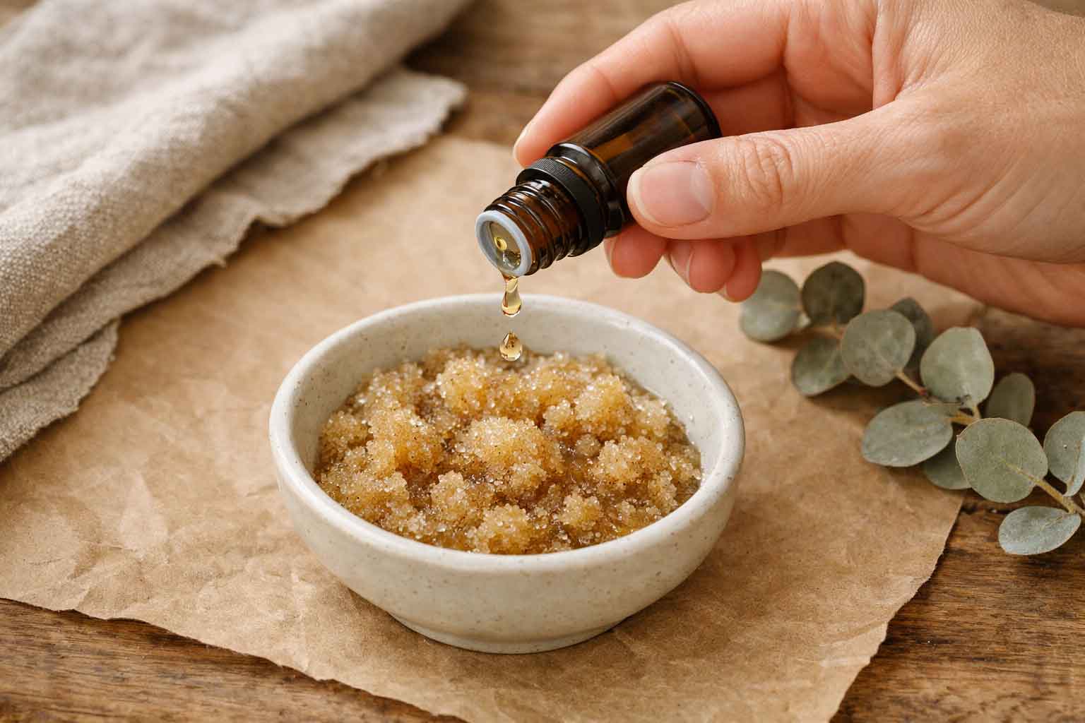 Wenn du möchtest, füge 2–4 Tropfen ätherisches Öl hinzu und mische alles gründlich. Wenn du dein Scrub z.B. bräunlich haben möchtest, füge einfach etwas Zimt hinzu.