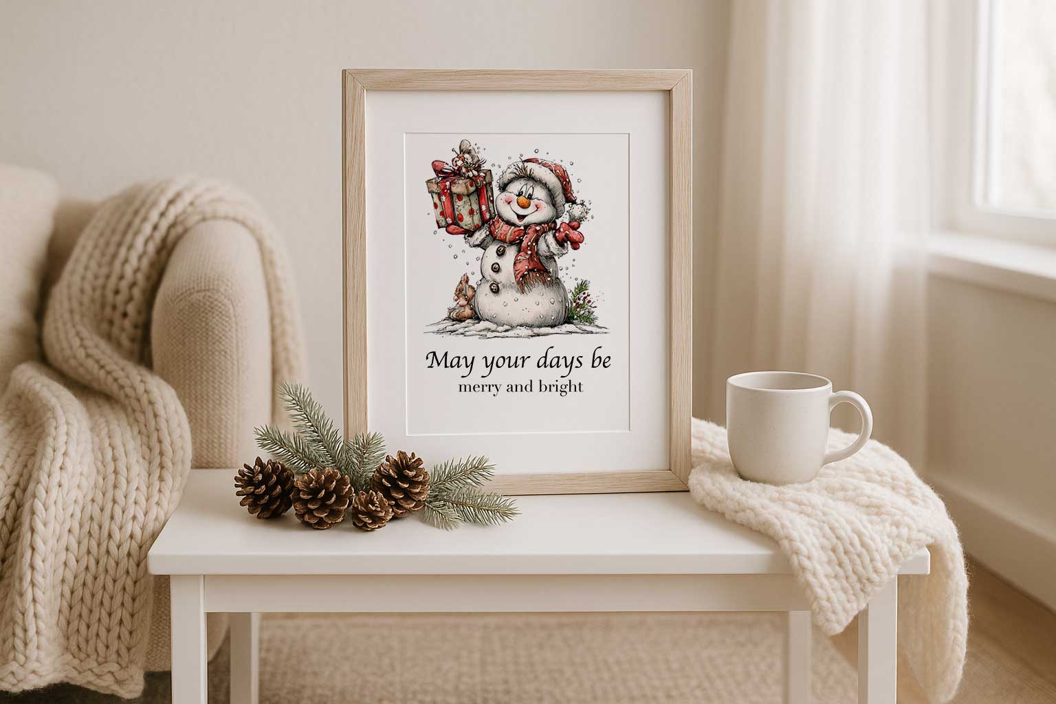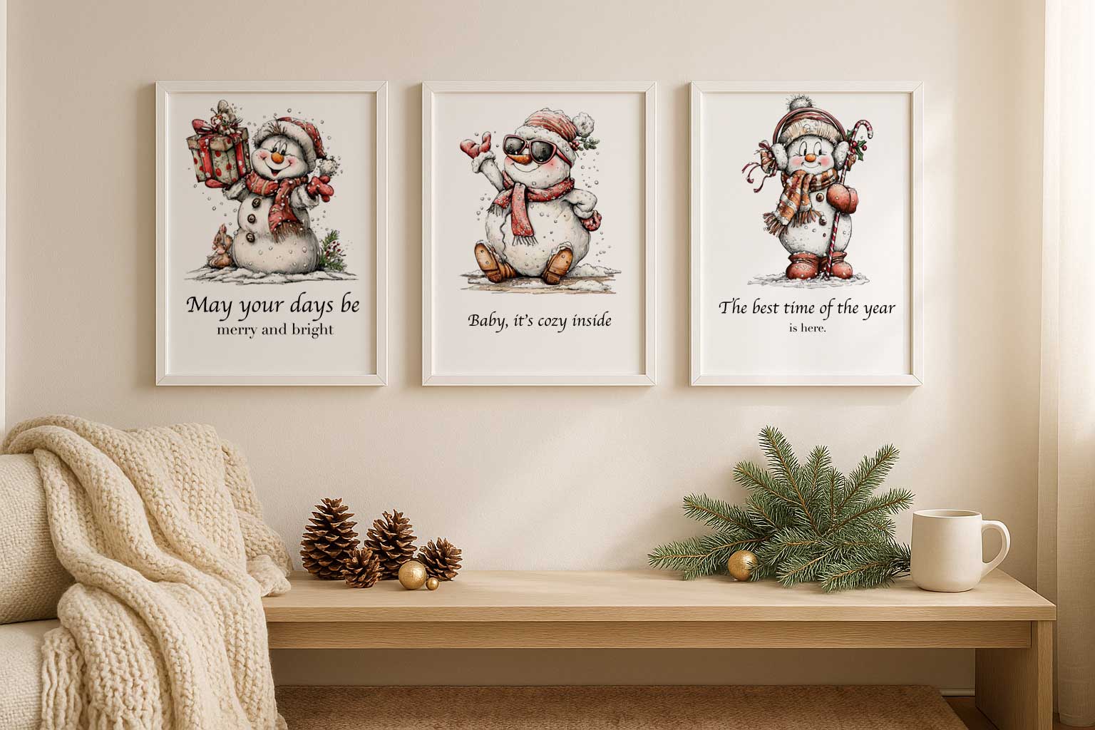 Dieses winterliche Schneemann Poster Set bringt pure Weihnachtsfreude und eine wohltuende Portion Gemütlichkeit in dein Zuhause.