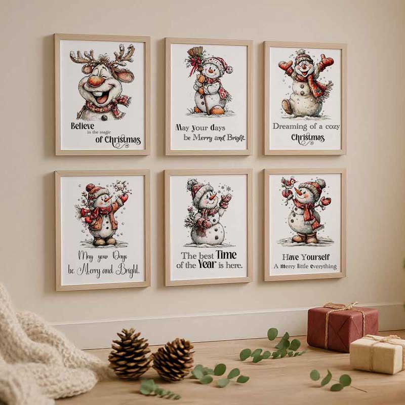 Dieses 6-teilige Poster Set wurde liebevoll gestaltet und verbindet niedliche Winterfiguren mit inspirierenden, festlichen Sprüchen. Ob gemütliche Schneemänner, kleine Wichtel oder ein süßes Winterhaus – jedes Bild bringt ein Stück Weihnachtsmagie in dein Zuhause.