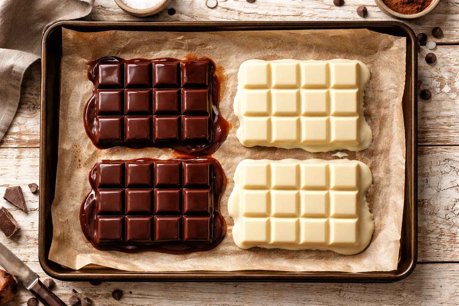 Lege das Backblech mit Backpapier aus. Dann legst du zwei Tafeln dunkle Schokolade und zwei Tafeln helle/weiße Schokolade nebeneinander auf das Backpapier.