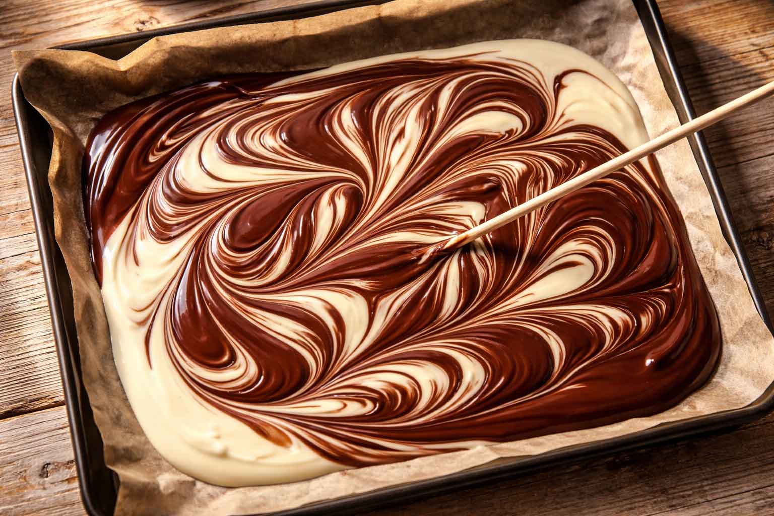 Sobald die Schokoladentafeln im Ofen weich geworden sind, nimmst du das Blech vorsichtig heraus. Mit einem Holzstäbchen fährst du von oben nach unten oder von rechts nach links (oder umgekehrt) durch die Schokolade, sodass sich dunkle und helle Schokolade berühren und leicht überlappen.